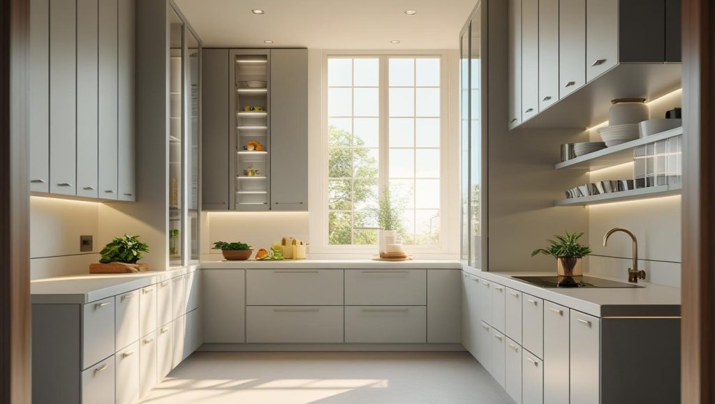 This design is ideal for small kitchens in Indian apartments, where maximizing vertical and corner spaces can make a huge difference.