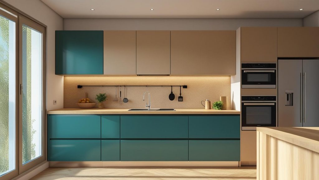 These combinations create contrast, depth, and elegance. You can apply darker tones to the lower cabinets for durability and lighter shades to the upper ones for an open, airy feel.