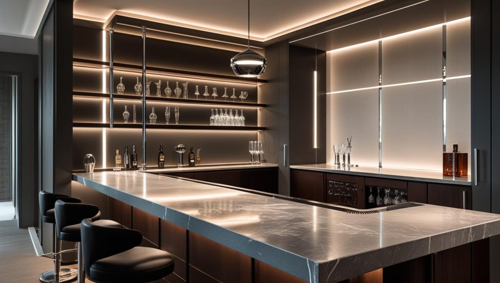 Your bar’s style should resonate with your personality and reflect your home’s overall theme. The look you choose sets the tone for your space and influences everything from material selection to lighting.